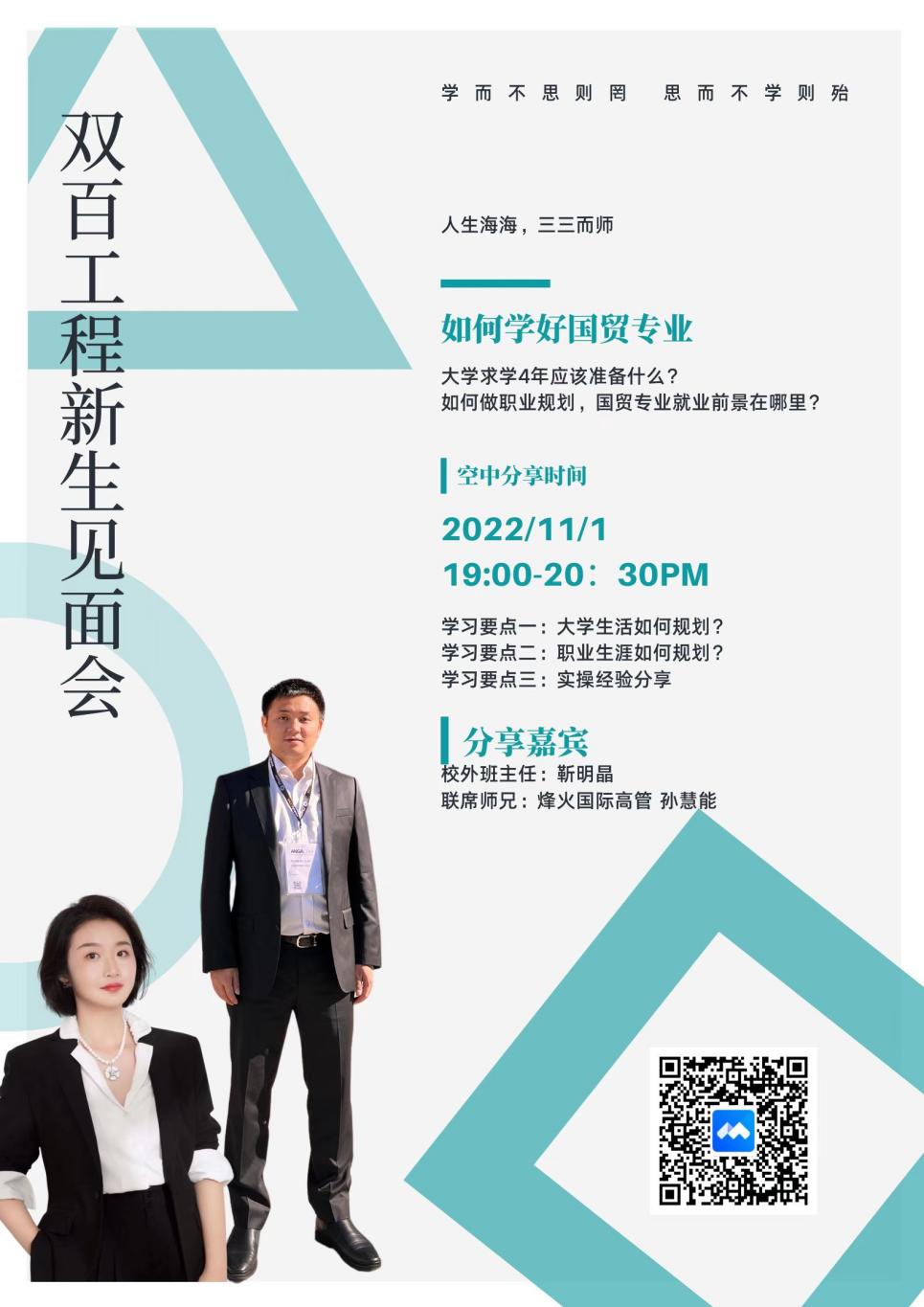 11月1日,国贸2241班的荣誉班主任友邦人寿保险有限公司业务经理靳明晶受邀参加线上课堂,她从老员工活、职业生涯发展和个人选择三个方面为同学们进行分享。她着重强调了英语学习的重要性,鼓励同学们学好英语,多参加英语角联系去提升自己的英语能力。为给予同学们更多有益的建议,她还邀请到国贸行业经验丰富的好友烽火国际高管孙慧能为同学们分析了国贸行业的就业形势、介绍了就业方向、传授了就业经验,帮助国贸专业的新生同学们做好求学准备和职业规划。
