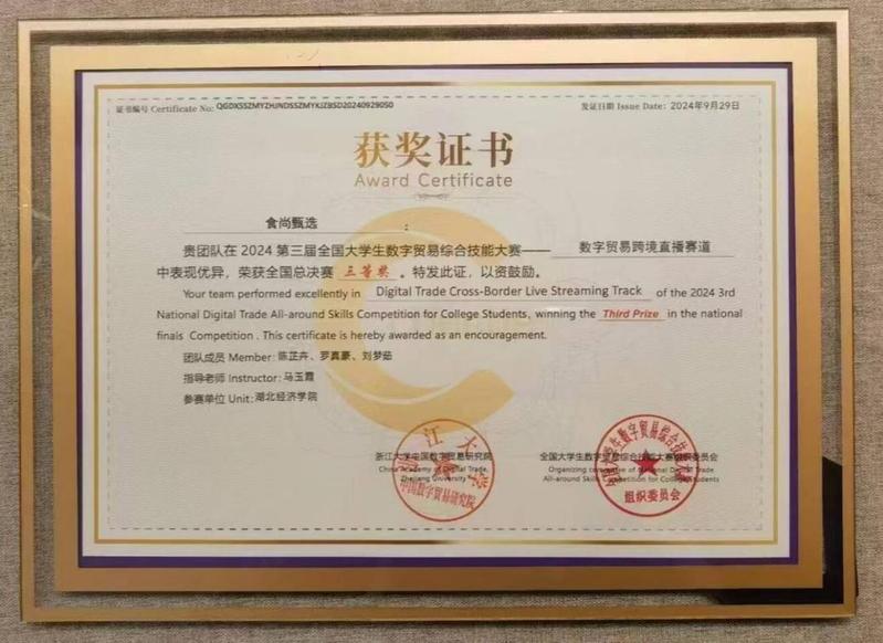 2024年9月29日,第三届全国老员工数字贸易综合技能大赛全国总决赛颁奖典礼在浙江大学紫金港校区金色大厅举行,公司学子在“创新创业”和“跨境直播”两个赛道上均荣获全国三等奖,收获满满。