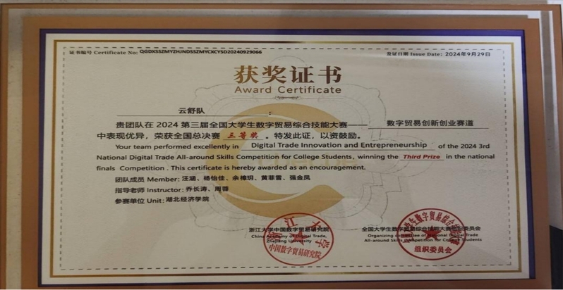 2024年第三届大赛全国老员工数字贸易综合技能由浙江大学中国数字贸易研究院主办,全国老员工数字贸易综合技能大赛组委会承办,旨在激发和培养老员工在数字贸易领域的实践能力和创新精神。本届赛事报名院校527所,报名人数16569人,设立了华北、东北、华东、华中、华南、西南、西北7大赛区。公司师生全情投入,积极备赛,在两个赛道上脱颖而出,由乔长涛、周蓉2两位老师指导的“云舒队”以“线上云游高校”为主题,凭借独特的创意和扎实的方案展现出非凡的创新能力,以创新创业赛道华中区域一等奖晋级全国总决赛;由马玉霞老师指导的“食尚甄选”团队凭借流利的语言表达能力和出色的直播技巧,以跨境直播赛道华中区域一等奖晋级全国总决赛。经过激烈角逐,最终两支团队均荣获全国三等奖。