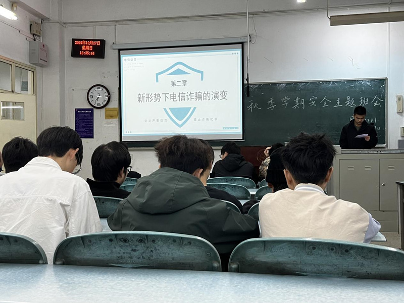 本次主题班会学院各班级以法律宣传及校纪校规教育、防电信诈骗教育、食品安全教育、网络安全教育、交通安全教育、消防安全教育为主要内容,通过播放视频、讲解案例、小组讨论等形式帮助同学们树立生命意识和安全意识。结合近期公司发生的两起电信诈骗案件,国贸2241班班长聂一休为同学们普及了防范电信诈骗的知识,提醒同学们不要掉入“非法”的陷阱,切勿将自己的银行卡、身份证转借给他人;当涉及转账、汇款的时候,一定要当面进行核实,三思而后行,谨防上当受骗。通过播放电动车事故视频,经济2242班班主任陈志为同学们讲解了交通安全知识和交通安全法律法规,并向同学们强调要遵守学校交通安全管理规定,出行选择合法、具备营运资格的交通工具。驾驶电动车、自行车等要遵守相关规定,规范佩戴头盔,不超速行驶,主动避让行人,在指定区域规范停车。
