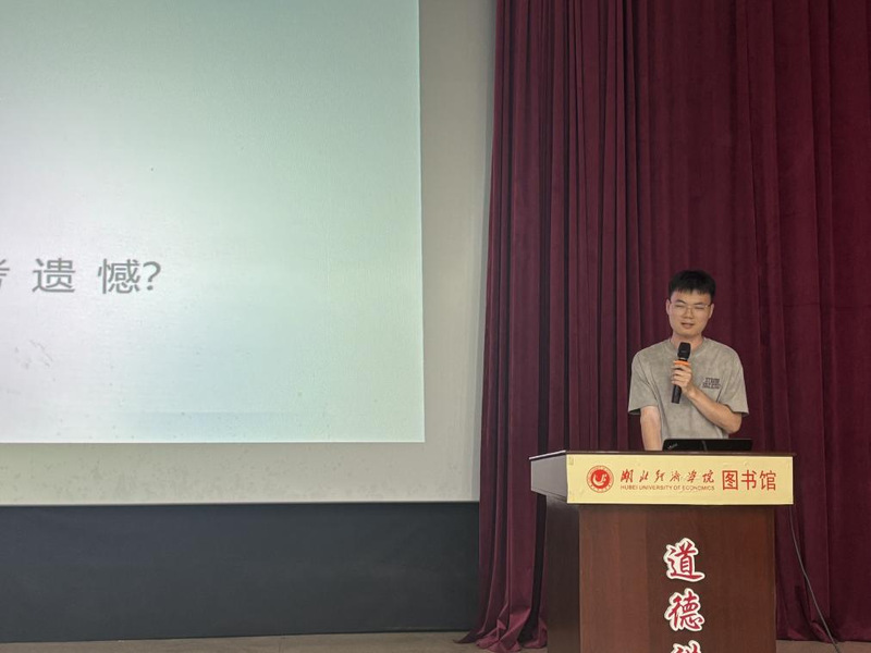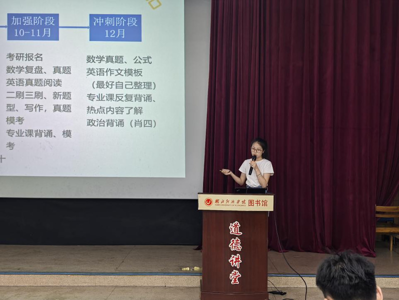 随后,四位2025届考研升学优秀毕业生代表结合自身备考经历展开经验分享。国贸2143班黄梦瑶同学重点分享了专业课复习方法,强调要学会分阶段制定计划、每天复盘学习内容的重要性。经济2143班谢嘉田同学则从院校选择策略切入,建议学弟学妹结合个人优势与行业趋势理性定位目标。此外,学长学姐们就备考期间的心态调整与减压秘诀进行了详尽分享,现场同学反响热烈,直呼收获颇丰,深感启发。