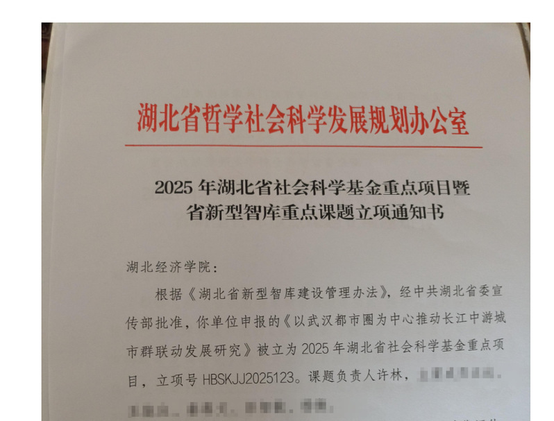 日前,湖北省哲学社会科学工作办公室公布了2025年湖北省社科基金重点项目暨省新型智库重点课题立项名单,公司许林教授申报的《以武汉都市圈为中心推动长江中游城市群联动发展研究》获批2025年湖北省社科基金重点项目,本次立项为2025年科研工作再次注入新活力,将有力推动学院在科研领域的快速发展和整体水平的提升,学院也将继续坚持做好有组织的科研活动,助力应用经济学学科高质量发展。