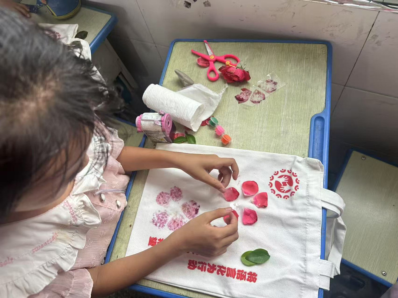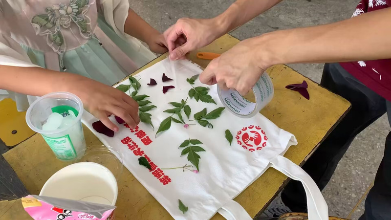 一年级员工任盈鑫兴奋地说:“把树叶变成花纹好神奇!我要把这块布送给妈妈。”活动现场,支教老师陶晶晶介绍:“拓染是国家级非遗技艺,我们希望通过动手实践,让孩子们感受传统文化的魅力,在心中种下守护非遗的种子。”